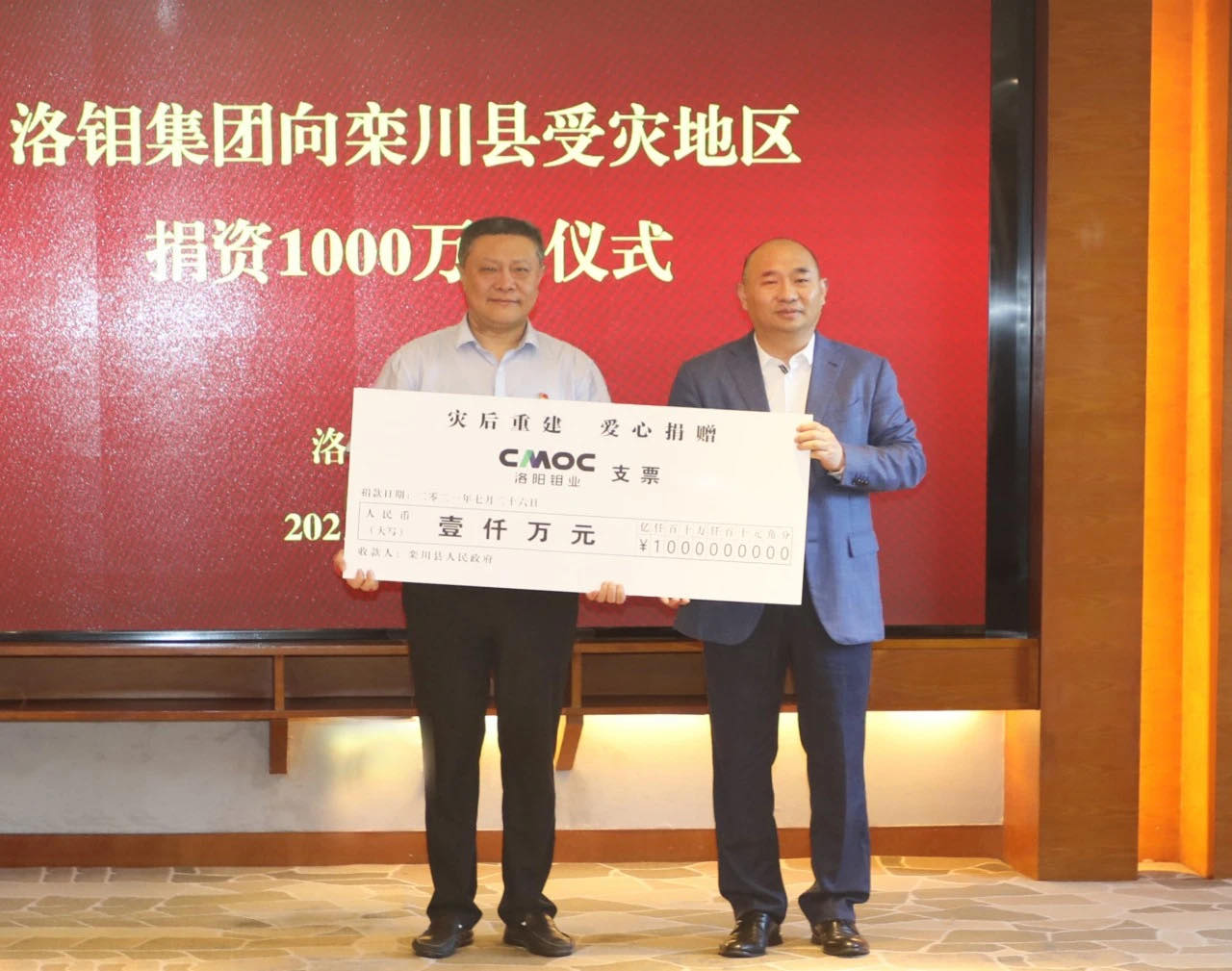 得知栾川受灾的情况后,洛阳钼业总裁孙瑞文第一时间赶赴栾川,了解受灾情况。7月26日,孙瑞文代表公司向栾川县人民政府捐资1000万元人民币,用于栾川的防汛救灾和灾后重建,以实际行动为河南加油、为栾川加油。