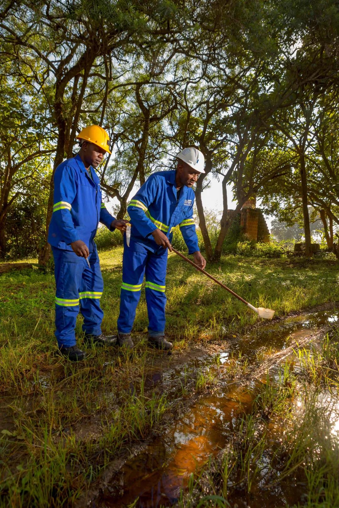 (洛阳钼业刚果(金)矿区的环保工作人员正在进行水样提取)