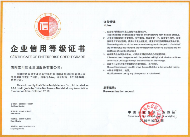 近日,经全国有色金属行业企业信用等级评价委员会评审、公示,并报国家工信部备案,洛钼集团、江西钨业集团、湖南黄金集团等22家企业被中国有色金属工业协会评为2019年度“企业信用评价AAA级信用企业”,并授予证书和牌匾。