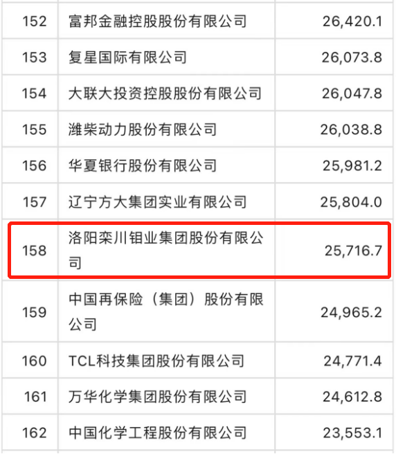 7月25日晚,全球最知名商业期刊《财富》杂志公布了中国500强排行榜,洛阳钼业位居第158位。