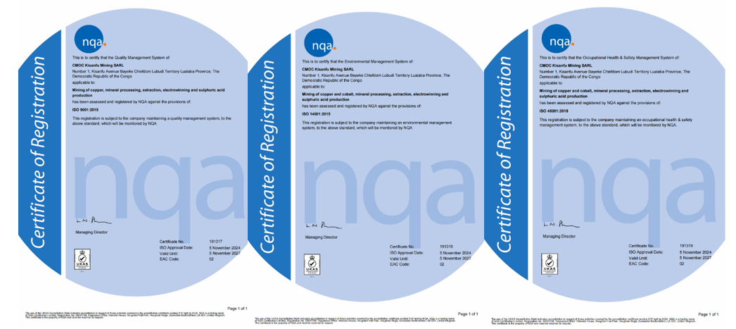 近日,洛阳钼业KFM公司顺利通过南非NQA认证机构的ISO 9001质量管理体系、ISO 14001环境管理体系及ISO 45001职业健康安全管理体系认证外部评审,并于11月5日成功获得“三体系”认证证书。